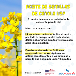 ACEITE DE SEMILLAS DE CANOLA USP, se obtiene de la Brassica Napusl, planta de la familia de las brasicáceas. Se cultiva en todo el mundo para diferentes usos.
