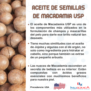 ACEITE DE SEMILLAS DE MACADAMIA USP, es uno de los componentes más utilizados en la formulación de champús y mascarillas del pelo para darle ese brillo natural tan deseado. también puede ser muy beneficioso para nuestra piel, dejándola suave e hidratada.