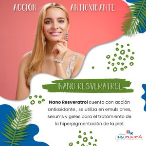 El Trans-resveratrol posee un elevado potencial antioxidante, lo que inhibe la acción de radicales libres y previene el envejecimiento cutáneo. Asimismo, actúa en la protección contra los daños causados por la radiación ultravioleta en la piel, previniendo también el desarrollo del cáncer de piel.