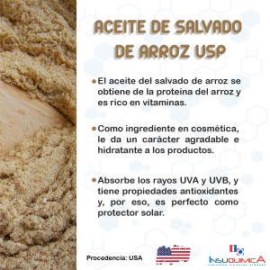 ACEITE DE SALVADO DE ARROZ USP, es fuertemente utilizado en cosmética como reparador de las arrugas y otros signos que aparecen como consecuencia del paso del tiempo. Esto es gracias a la vitamina E y a los antioxidantes que regeneran la piel siendo muy bueno en tratamientos faciales y corporales.