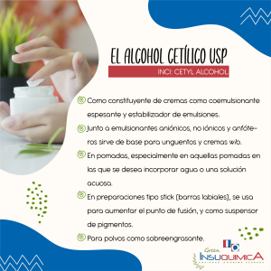 El Alcohol Cetílico USP , Es un emulsionante, que aumenta la estabilidad de las emulsiones, se utiliza en la industria cosmética como un pacificante en shampoo , o como un emoliente, emulsionante o agente espesante en la fabricación de cremas para la piel y lociones. También se emplea como un lubricante para tornillos y tuercas.