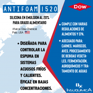 ANTIESPUMANTE FOOD GRADE - ANTIFOAM 1520, es de grado alimenticio que sirve como agentes tensoactivos que actúan por medio de tensiones superficiales intermedias para lograr desestabilizar la espuma y liberar el aire retenido en la emulsión. Algunas ventajas del uso del Antifoam son: