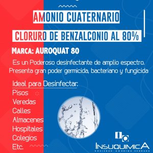 AUROQUAT 80 - CLORURO DE BENZALCONIO 80%. es un ANTIBACTERIANO de amplio espectro, y es usado en plantas de empaque, tratamiento de equipos, cajones y desinfección de rodados.
