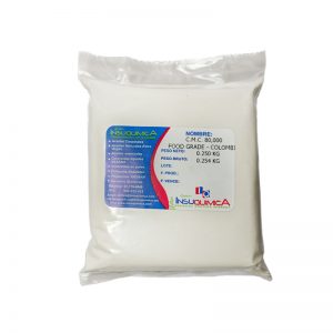 Este tipo de CMC es utilizada también como espesante, estabilizante y agente de retención de agua en las industrias alimenticias. Este producto no es para consumo directo.C.M.C. 80,000 FOOD GRADE – COLOMBIA – Bolsa x 1 Kg