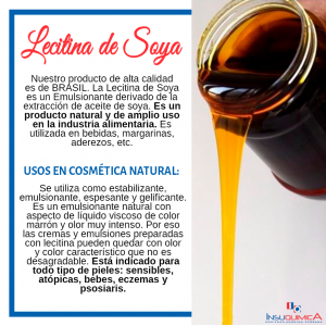 Presentación: 1 Kg. Nuestro producto de alta calidad es de BRASIL.  La Lecitina de Soya es un Emulsionante derivado de la extracción de aceite de soya. Es un producto natural y de amplio uso en la industria alimentaria. Es utilizada en bebidas, margarinas, aderezos, etc. Usos en cosmética: La lecitina es una producto natural y es por eso que se utiliza en cosmética natural y ecológica. Se utiliza como Estabilizante, emulsionante, espesante y gelificante. Es un emulsionante natural con aspecto de líquido viscoso de color marrón y olor muy intenso. Por eso las cremas y emulsiones preparadas con lecitina pueden quedar con olor y color característico que no es desagradable. Está indicado para todo tipo de pieles: sensibles, atópicas, bebes, eczemas y psosiaris. Dosis: 0.5% al 5%