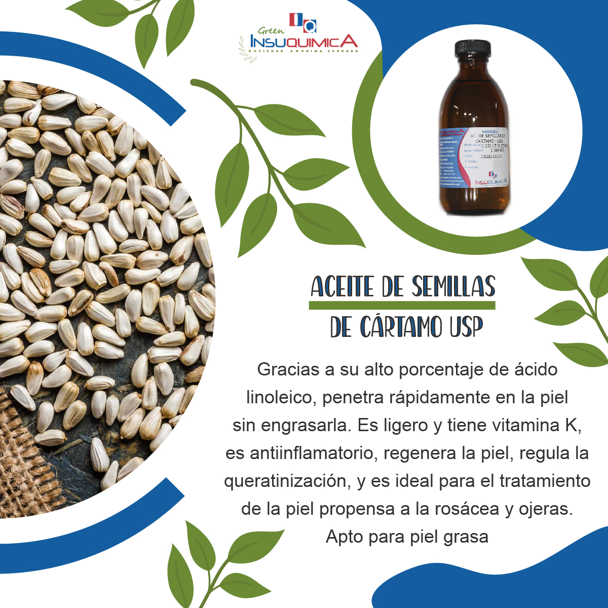 ACEITE DE SEMILLAS DE CARTAMO USP, es un aceite muy ligero, particularmente conveniente para la piel grasa. Gracias al alto porcentaje de ácido linoleico, penetra rápidamente en la piel sin engrasarla. En combinación con otros ingredientes antiinflamatorios, este aceite es ideal para el cuidado de la piel altamente impura. El aceite de cártamo contiene vitamina K, soporte ideal para el tratamiento de la piel propensa a la rosácea y ojeras