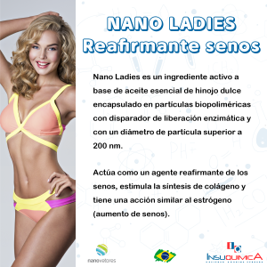 NANO LADIES - REAFIRMANTE DE SENOS - NANOVETORES, Nano Ladies es un ingrediente activo a base de aceite esencial de hinojo dulce encapsulado en partículas biopoliméricas con disparador de liberación enzimática y con un diámetro de partícula superior a 200 nm. La encapsulación de la mezcla a través de la Tecnología Nanovetores permite la estabilización de componentes extremadamente sensibles y complejos para ser formulados en su forma libre, también le da a los activos un aumento en la permeación de la piel, un aumento en lo sensorial en el producto final, y tiene una alta hidratación como multifuncionalidad., ya que actúan sobre la reposición de lípidos y previenen la pérdida de agua transepidérmica.