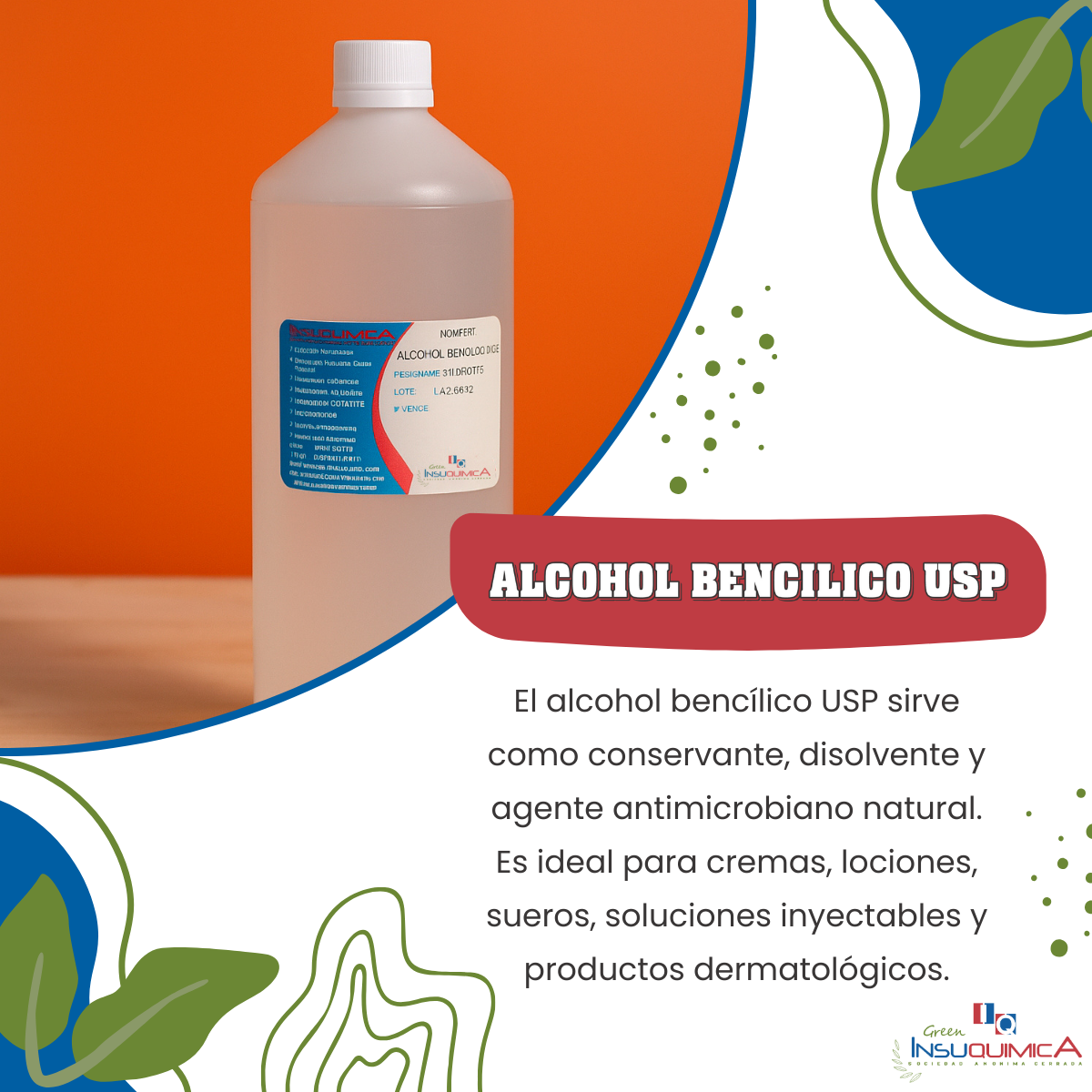 ALCOHOL BENCILICO USP, PRESERVANTE, antimicrobiano usado en cosmética, alimentos, y formulaciones farmacéuticas, a concentraciones superiores a 2% v/v.