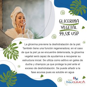 GLICERINA VEGETAL 99,5% USP. Es un HUMECTANTE muy utilizado en jabones de tocador. En la elaboración de productos de consumo. Principalmente, se utiliza para preparar extractos de té, café, jengibre y otros vegetales; fabricación de refrescos; aditivo (tipo tensioactivo comestible) para mejorar la calidad del producto.