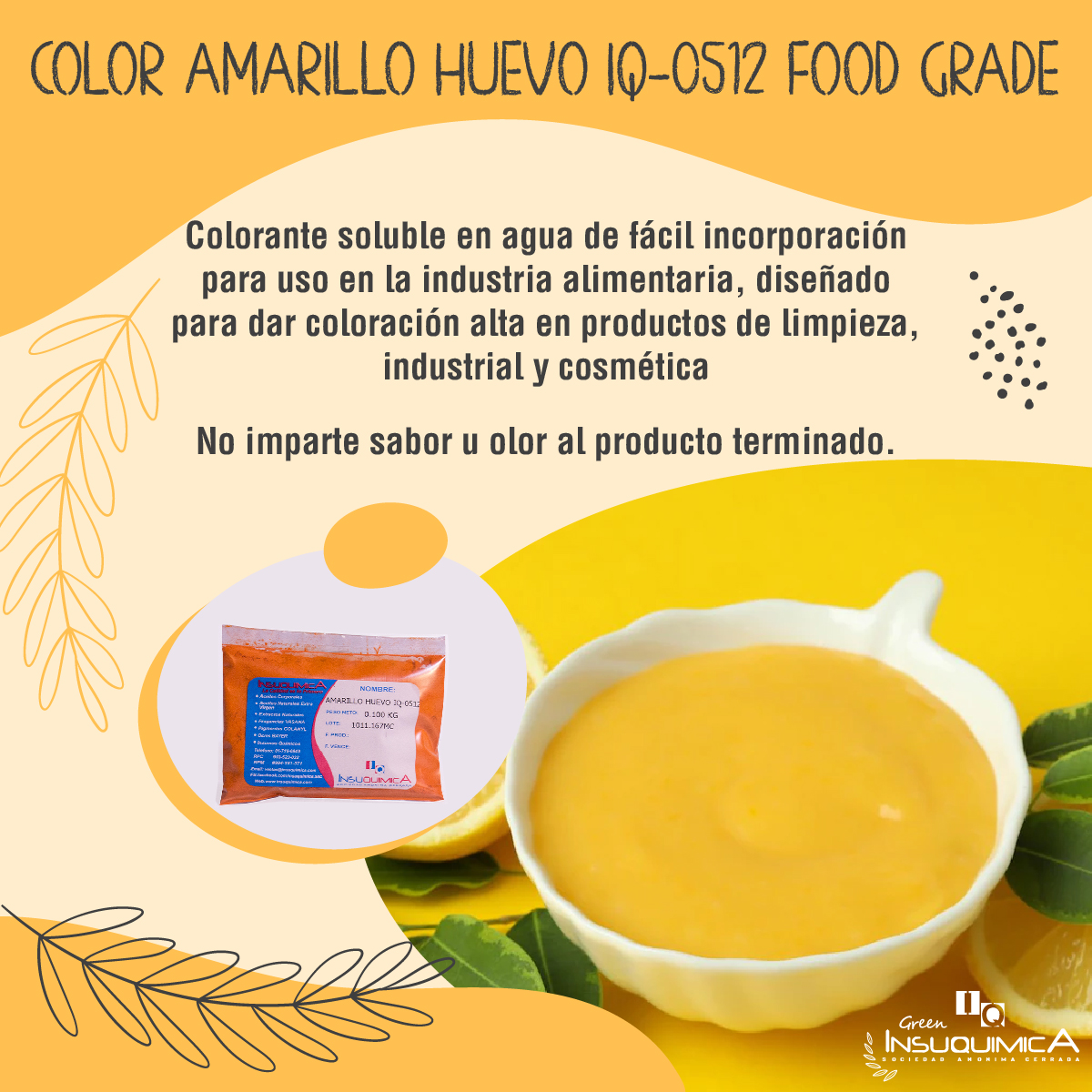 COLOR AMARILLO HUEVO IQ-0512 FOOD GRADE, producto para uso en la industria alimentaria que esta especialmente diseñado para dar coloración alta, es usado también en productos de limpieza, industrial y cosmética. Al mezclarse con el agua da una solución translúcida y transparente.