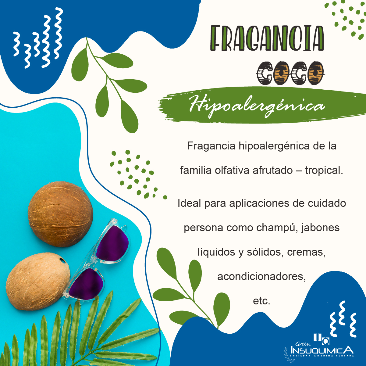 FRAGANCIA COCO HIPOALERGÉNICA, es una nueva fragancia HIPOALERGÉNICA de la familia olfativa Afrutado – Tropical, esta agradable fragancia sin alérgenos se inicia con notas lactónicas que se funden en un corazón tropical y floral entorno al coco y el jazmín.