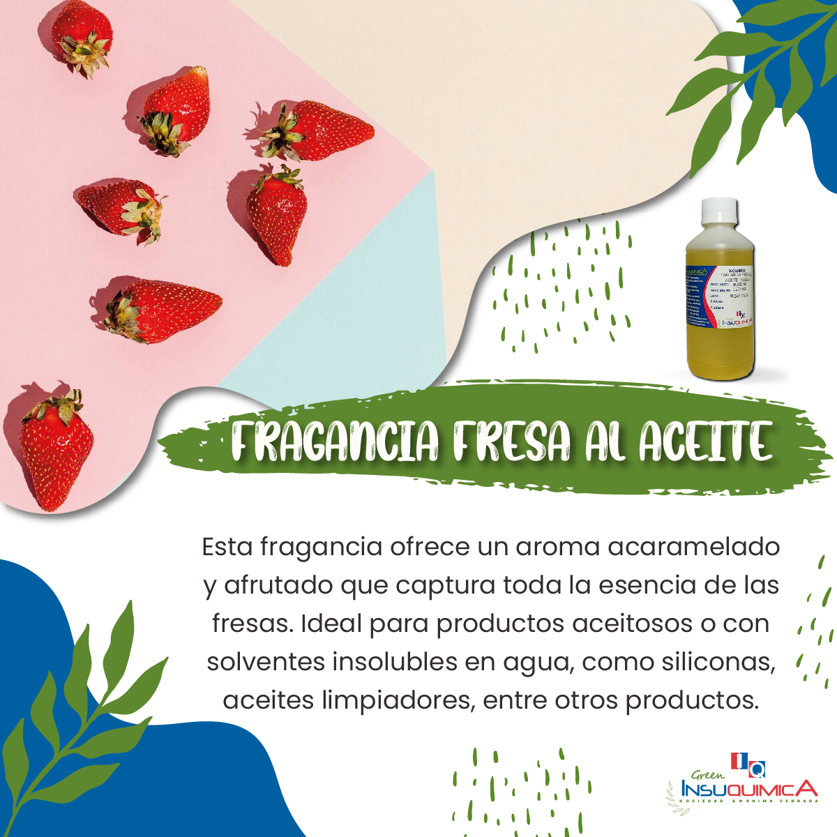 La Fragancia fresa al Aceite es una fragancia con agradable acaramelado y afrutado aroma de las fresas, recomendado para productos aceitosos o con solventes insolubles en agua. Siliconas, aceites limpiadores de muebles y similares.