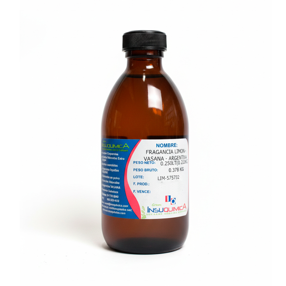 La Fragancia Limón de la marca Vasana de Argentina, es una fragancia de agradable aroma y soluble al agua, teniendo un desarrollo de aroma exclusivo para productos limpieza hogar, limpieza automotriz, etc.