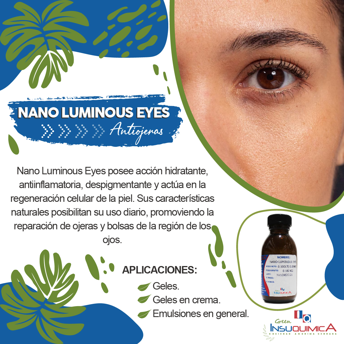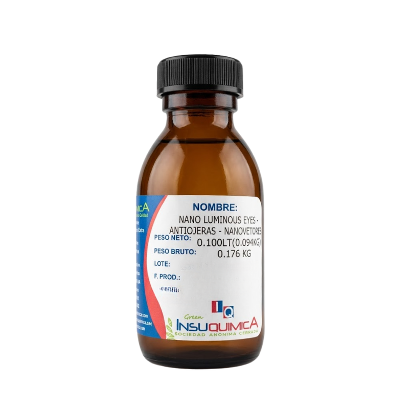 NANO LUMINOUS EYES – ANTIOJERAS – NANOVETORES, Nano Luminous Eyes es un blend de aceites esenciales encapsulados en partículas lipídicas, el insumo tiene propiedades que garantizan acción hidratante, antiinflamatoria, despigmentante y de regeneración celular. Es indicado para uso en ojeras y bolsas en la región suborbital, pues actúa en la regeneración del local.